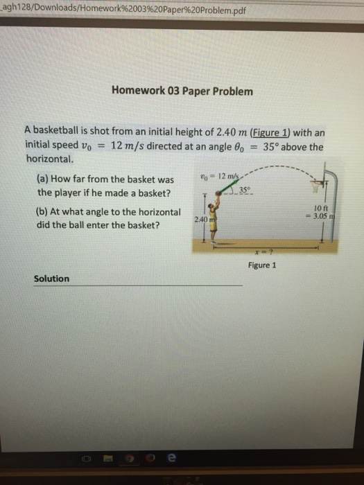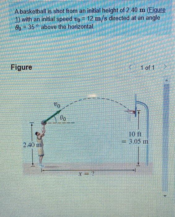 A basketball is shot from an initial height of 2.4 m with an initial speed (v0 = 12 m/s) directed at an angle (35 degrees) above the horizontal. A basketball is shot from an initial height of 1.68 m (for illustration only see fig. To find out how far from the basket the player was when the shot was made,.