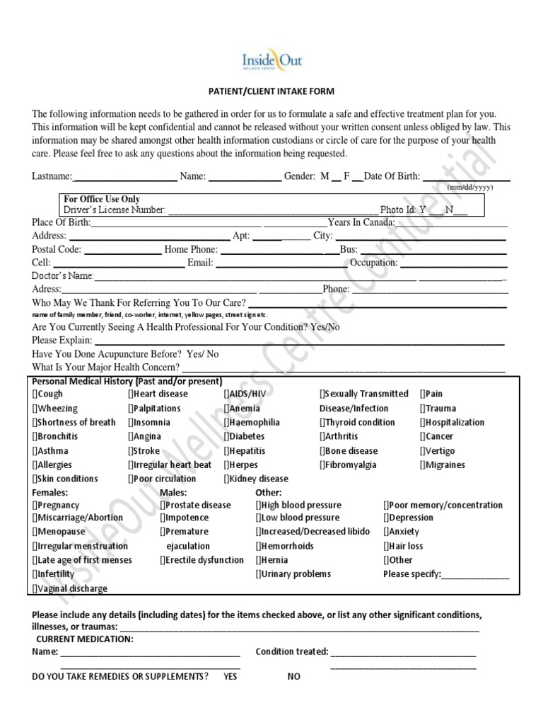Free Acupuncture Intake Form PDF Word