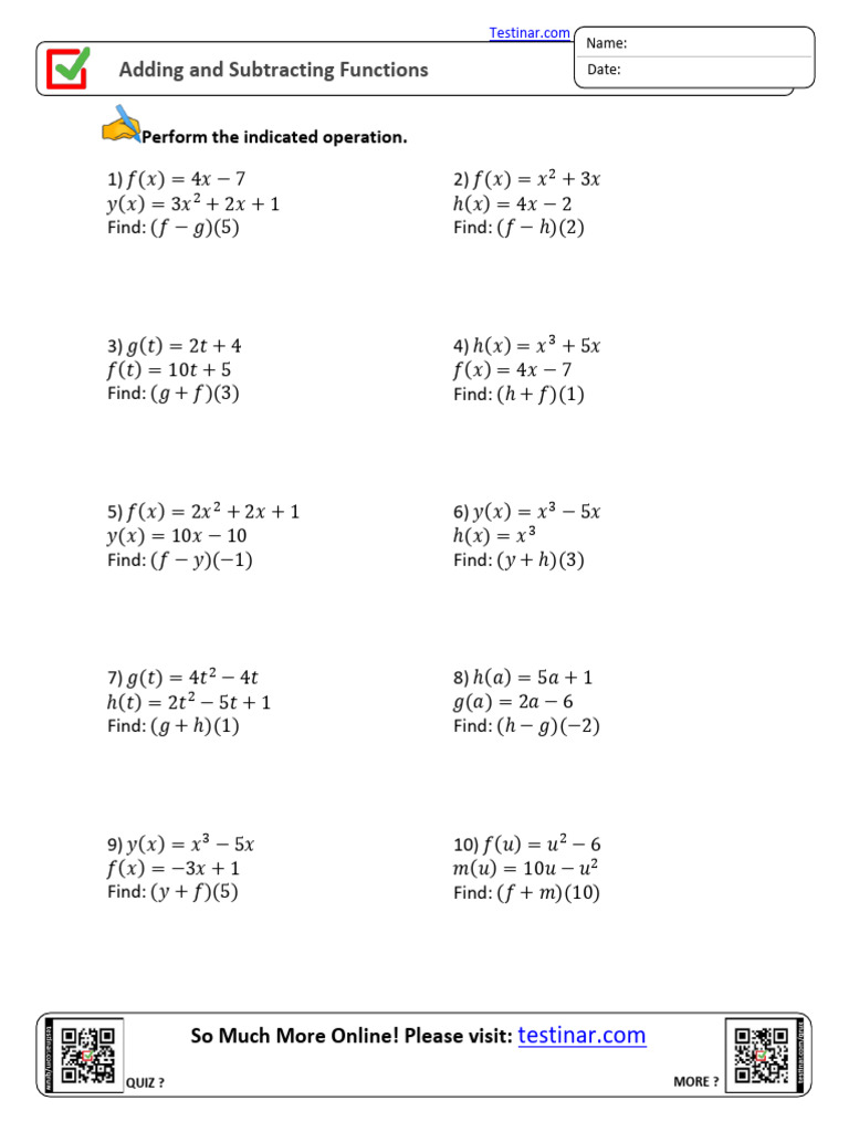 Adding And Subtracting Functions Worksheet - Worksheets are adding and subtracting functions, adding and. Showing 8 worksheets for addition and subtraction of functions.