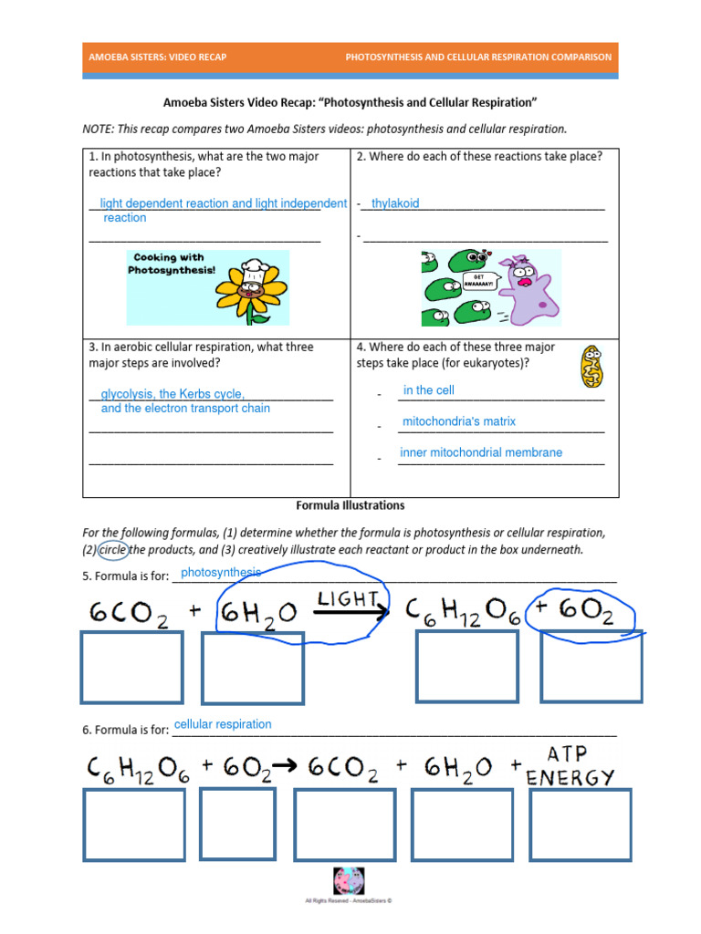 Respiration and photosynthesis video worksheet. How do green cells make food? Above handout compares two different video clips: This recap compares two amoeba sisters videos: In photosynthesis, what are the two major.