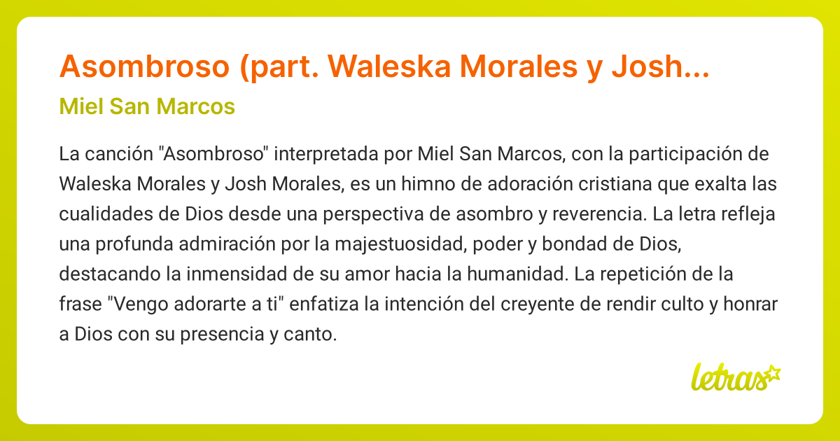 English translation of lyrics for asombroso by miel san marcos feat. Acordes de asombroso, miel san marcos: Tú eres digno de toda la adoración. Letra y acordes de guitarra. Aprende a tocar esta canción. Cuán hermoso, no tienes comparación. Te damos gloria, te damos. Waleska morales & josh morales.