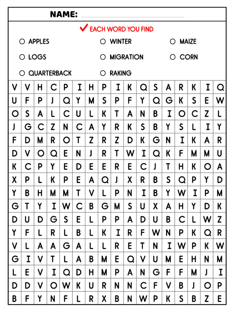 There are 3 autumn themed word searches for kids with varying levels of difficulty: The puzzles are all free.