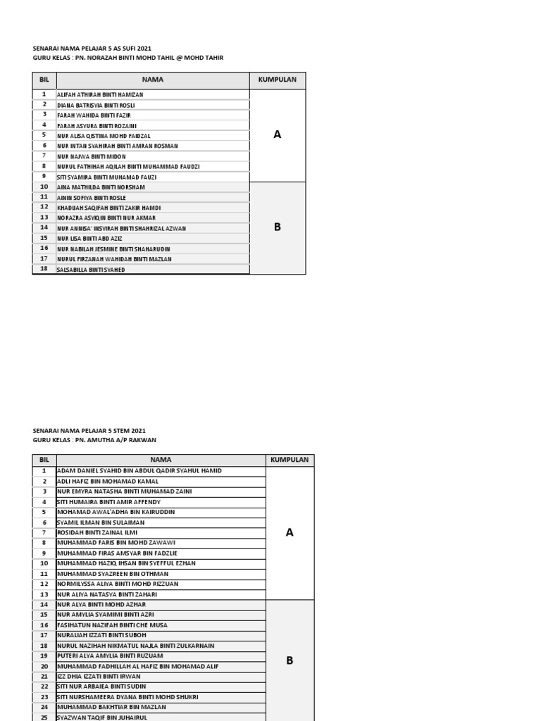 Senarai Nama Kumpulan A & B Form 5 2021 PDF