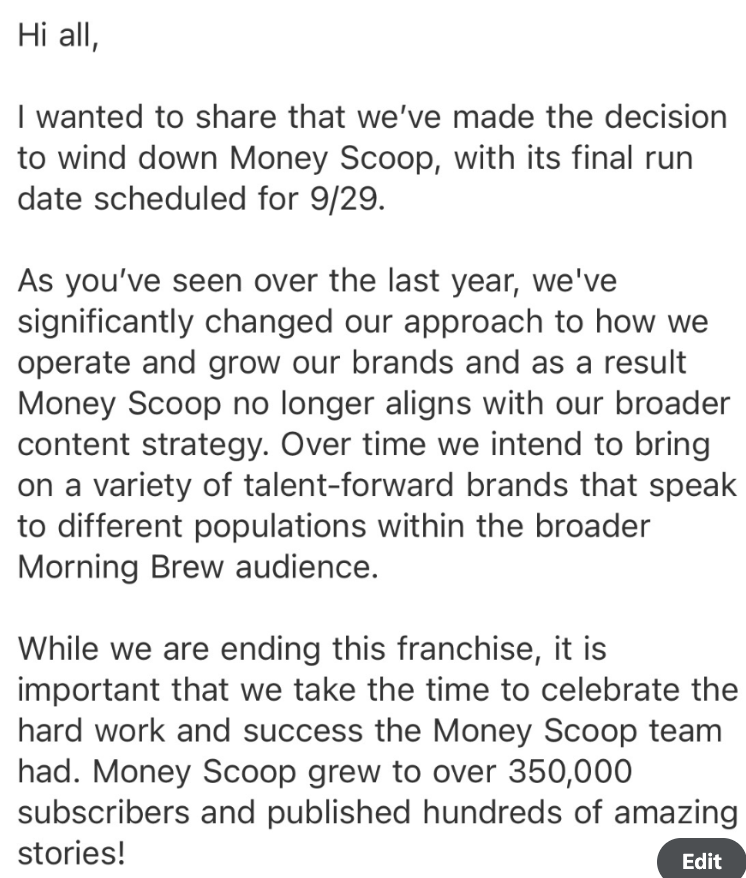 Ben Mullin on Twitter "News Morning Brew is cutting Money Scoop, its