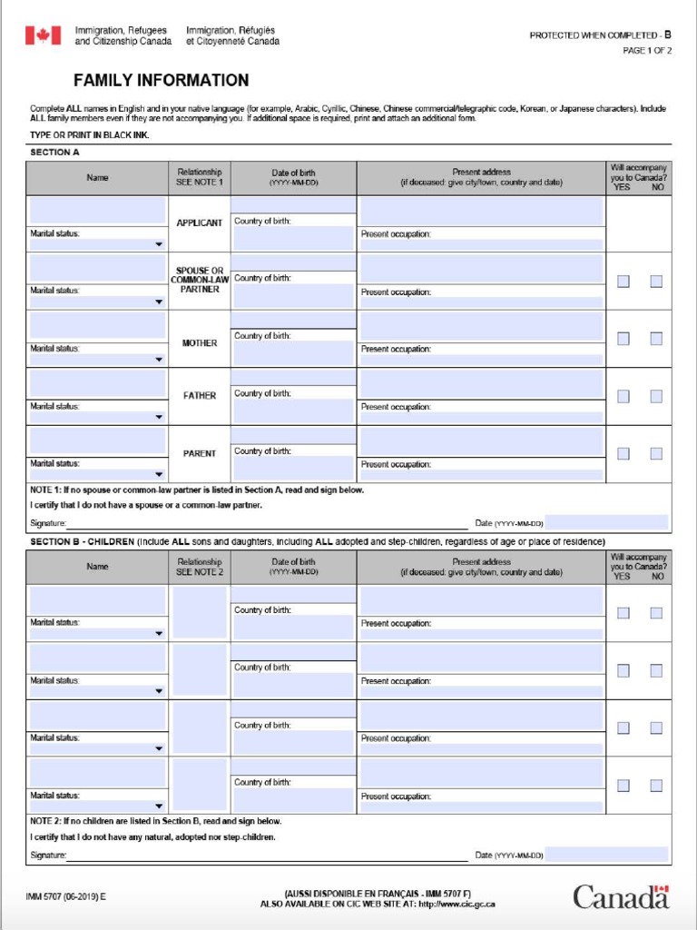 Immigration, refugees and citizenship canada created date: Family information (imm 5707) who needs to fill out this form? You and each one of your family members must fill out and sign their own forms even if you are travelling together as a family. The family information form (imm 5707) is one of the important documents required for various canadian immigration.