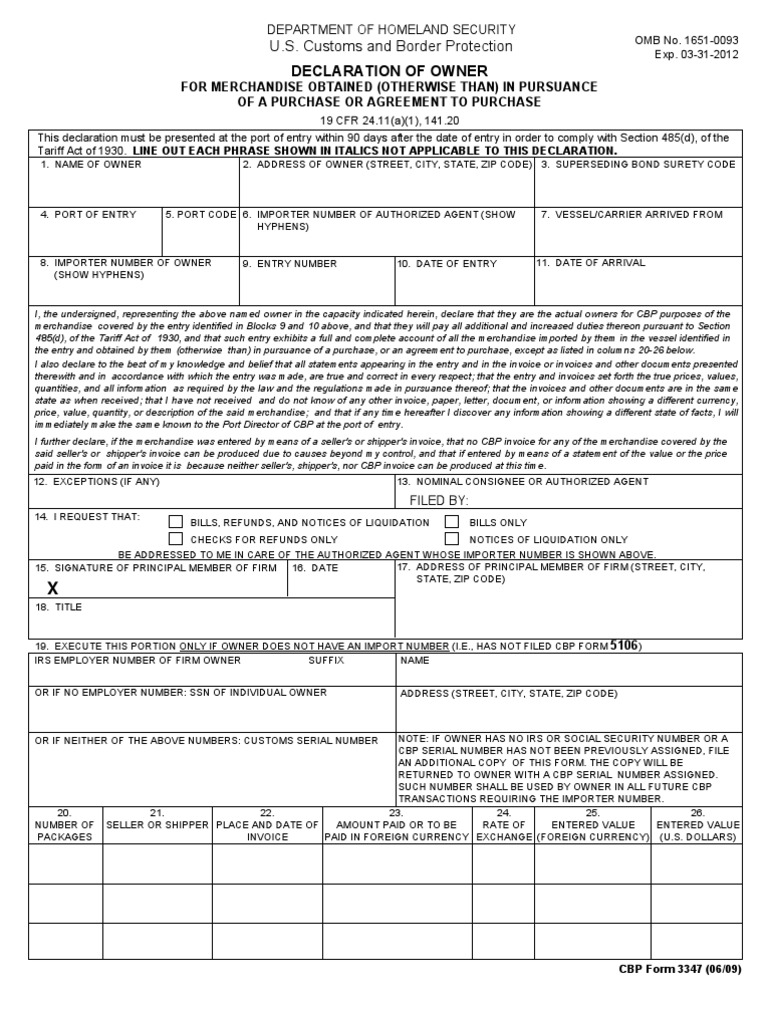Cbp form 3347, declaration of owner, is a declaration from the. The disclosure of the social security number on cbp form 3347 is mandatory. On june 24, 2011 cbp published a federal register notice that announced the creation of post. Cbp form 3347 and 3347a allows an agent to submit, subsequent to making the entry, the.