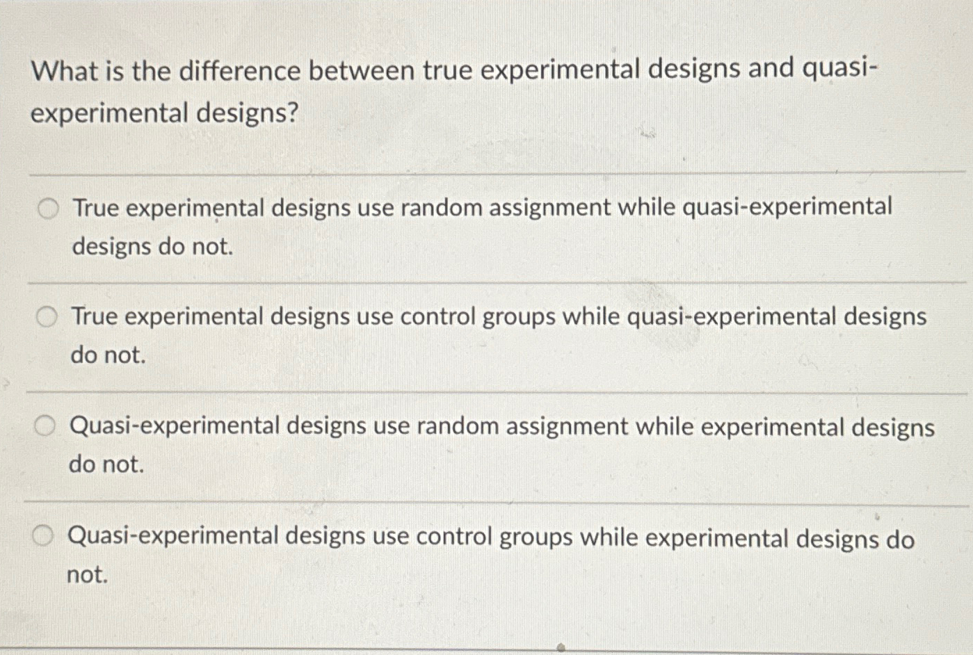 The subjects of the experiment are separated into a control group and an. True experimental design is best suited for explanatory research questions. True experiments require random assignment of participants to. Here are the three criteria for a true experiment: In true experimental design, research subjects are assigned to either an experimental group, which receives the treatment or intervention being.