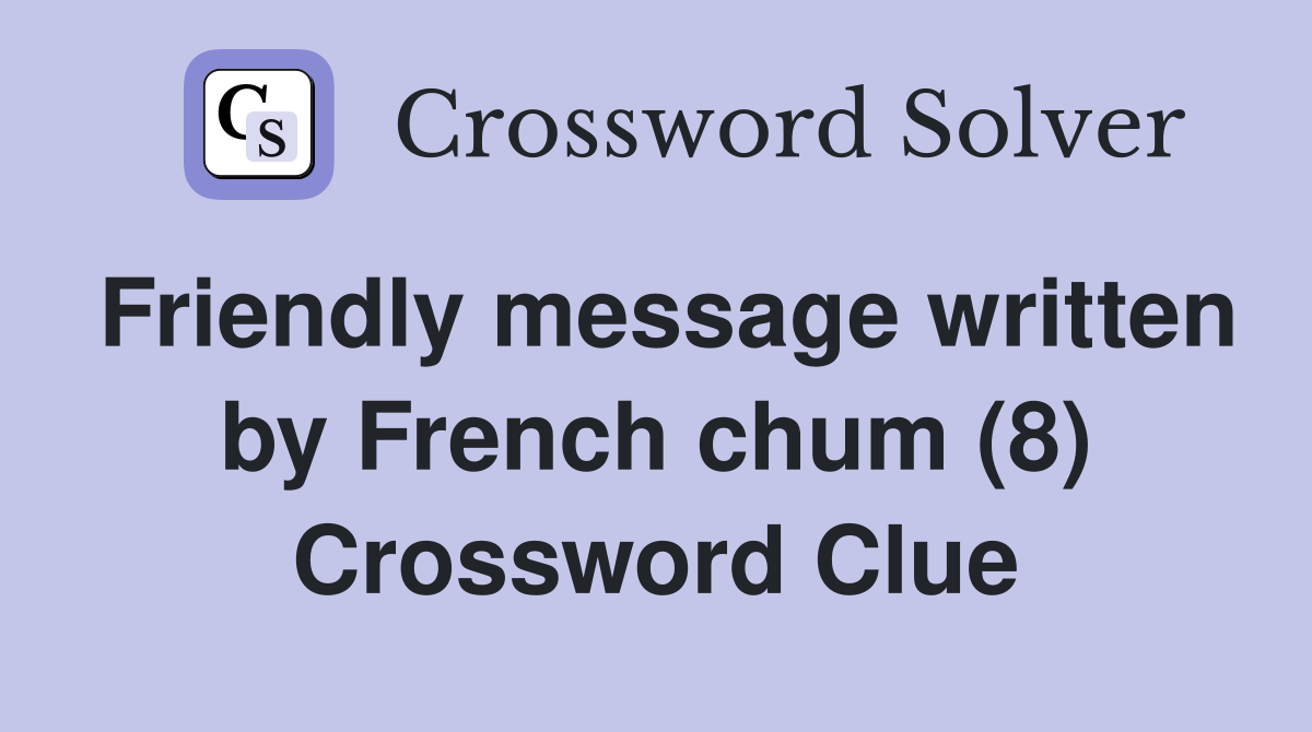 Bell warning sound was one of the. This post has the solution for swabbie's chum crossword clue. It is specifically built to keep. Spanish chum crossword clue was seen in daily themed mini crossword april 30 2021. This difficult crossword clue has appeared on puzzle page daily crossword december 22 2024 answers.