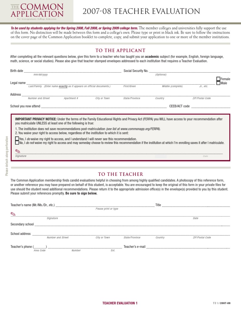Please mail this form and accompanying documents directly to each college/university admission office. Common app is working to ensure that every student can access higher education. Download and complete this form to request a teacher recommendation for your common app application. The teacher evaluation includes details about the teacher, their relationship with the student, and their letter of recommendation. A.