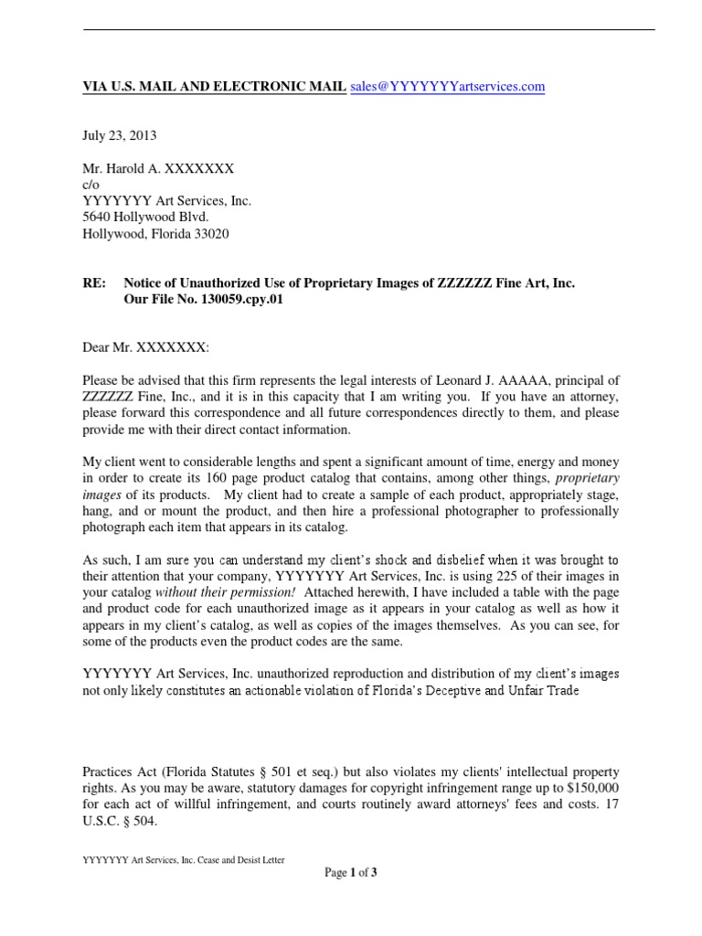 A copyright infringement cease and desist letter is a notice from a copyright owner that warns the recipient to stop using the owner’s material or. We hereby demand that you, within _______ days of this.