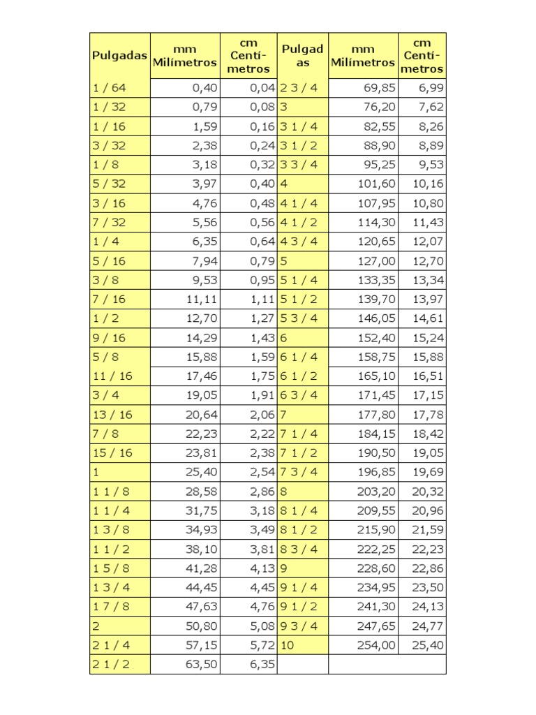 Tabla de pulgadas a milimetros mm y Tabla pulgadas a