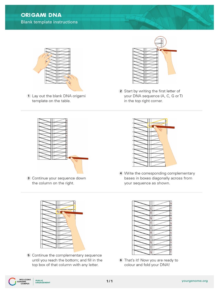 Learn how to fold a dna double helix model using a simple origami technique. Print out a copy of the origami dna helix template on regular printer paper. Starting at the top, start to fold, twist, and compress the dna until it folds onto itself. Learn how to write and colour a dna sequence using the blank dna origami template.
