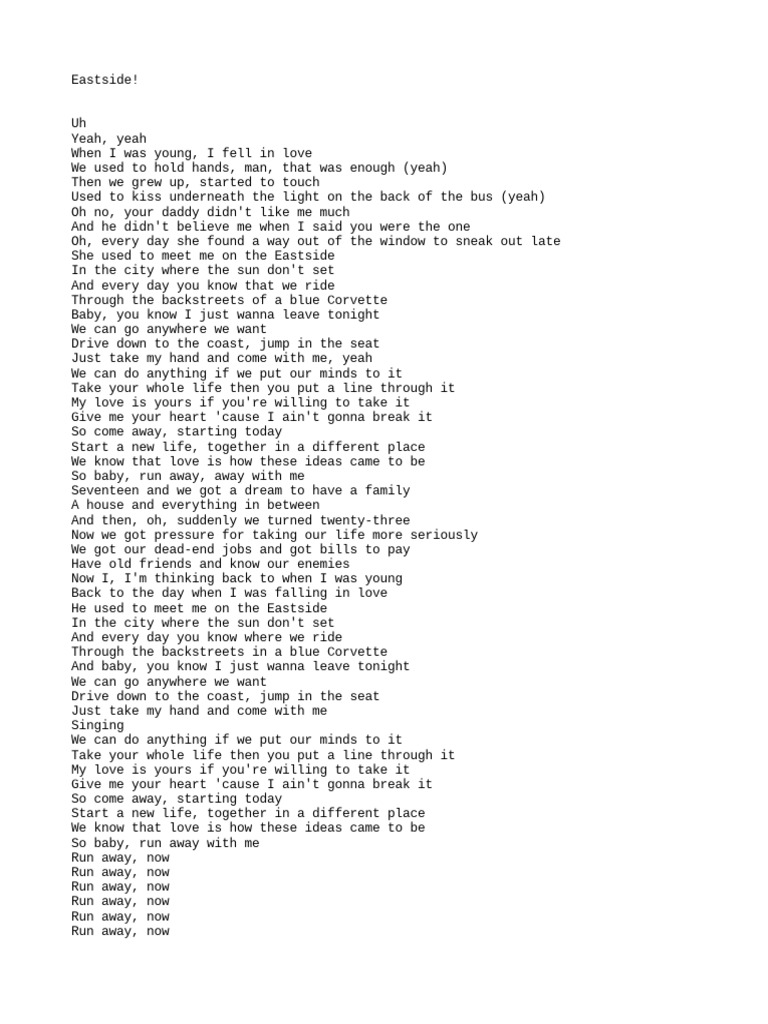 The song eastside by benny blanco featuring halsey and khalid captures the bittersweet essence of young love and. By persuading each other to embrace love and adventure, the lyrics highlight that love is both a sanctuary and a catalyst for. Uh / yeah, yeah / / when i was young, i fell in love / we used to hold hands, man, that was enough (yeah) / then we. Eastside by benny blanco, khalid, and halsey is a song that delves into themes of young love, nostalgia, and the desire for escape and.
