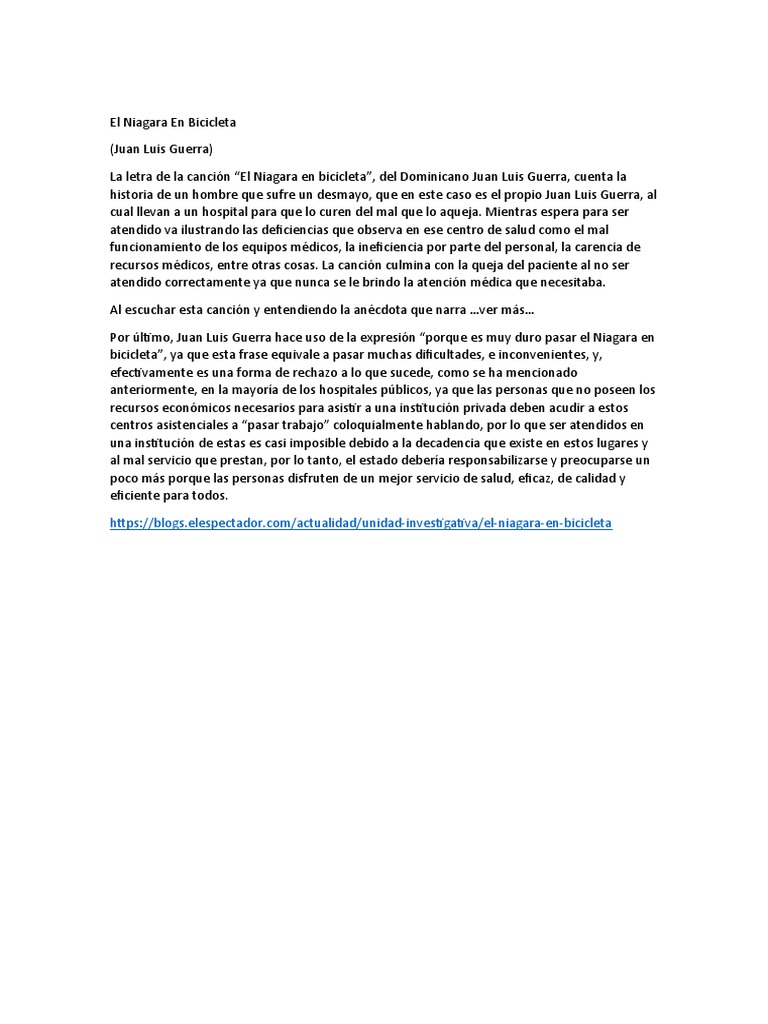 In the song , the guy that had to go to hospital está. Niágara en bicicleta by juan luis guerra tells a story of a medical emergency experienced by the narrator. What is el niágara en bicicleta about? He has a fever and feels faint. The use of metaphors, such as “passing niagara falls on a bicycle,” adds depth to.