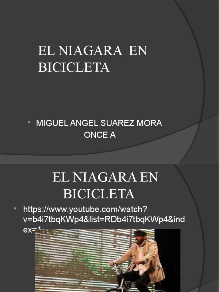 The metaphor of pasar el niágara en bicicleta (passing niagara falls on a bicycle) represents the immense challenge and difficulty. In the song , the guy that had to go to hospital está. What is el niágara en bicicleta about? Niágara en bicicleta by juan luis guerra tells a story of a medical emergency experienced by the narrator. It seems.