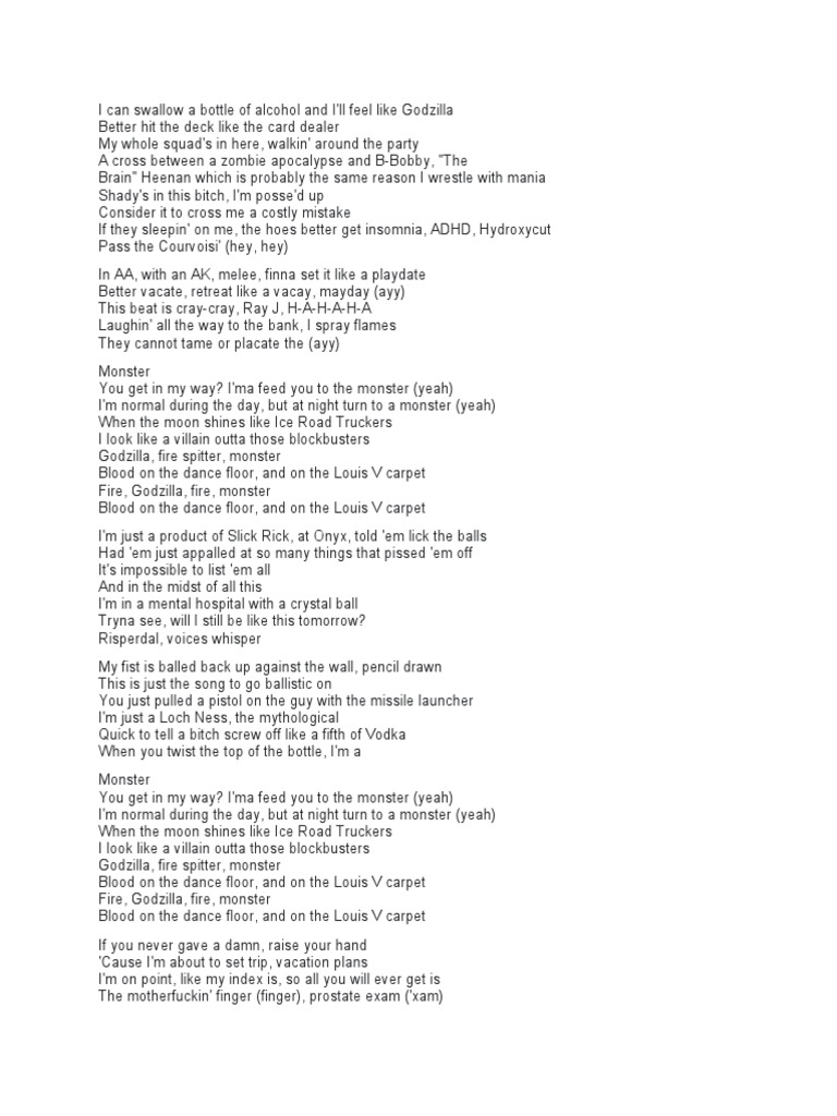 Ugh, you're a monster / i can swallow a bottle of alcohol and i'll feel like godzilla / better hit the deck like the. Watch official video, print or. (ugh, you're a monster) i can swallow a bottle of. • godzilla is a single by american rapper eminem featuring american rapper juice wrld, from the former's eleventh studio album music..