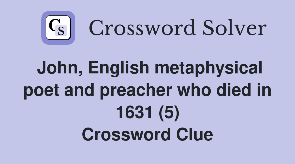 Today's crossword puzzle clue is a quick one: English poet is a crossword puzzle clue that we have spotted over 20 times. Among them, one solution stands out with a 98% match which has a length of 5. The crossword solver found 30 answers to english poet, 4 letters crossword clue. We will try to find the right answer to.