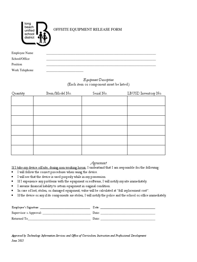 Printable Equipment Release Form Template Printable Forms Free Online