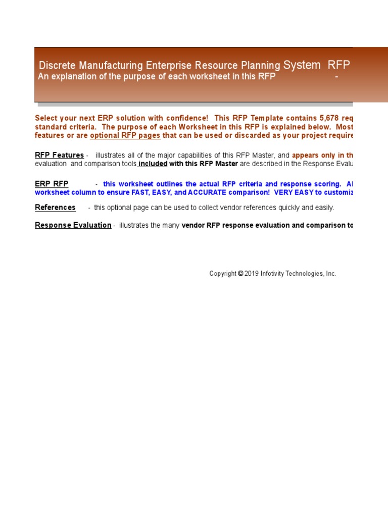 In this guide, we will delve into what makes a good erp rfp, what details you need to ask for, provide a sample erp template, and how to whittle down the options to the best fit for. Our erp requirements excel template provides you a structure and a list of functionality to build your own rfi or rfp requirements list to. Our erp rfp template provides you a structure and a list of functionality to build your own rfi or rfp requirements list to distribute to erp.