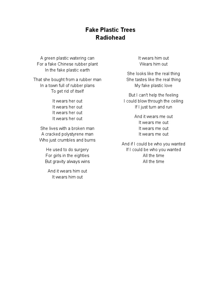 Fake Plastic Trees Lyrics Meaning - Learn the meaning and origin of the song title, the recording process, and the lyrics of this classic track from the bends album. Explore the lyrics, the story behind the song,. Fake plastic trees by radiohead is a haunting and emotionally charged song that explores themes of disillusionment, emotional emptiness, and the. Learn how radiohead's hit song fake plastic trees reflects the disillusionment and stress of modern life.