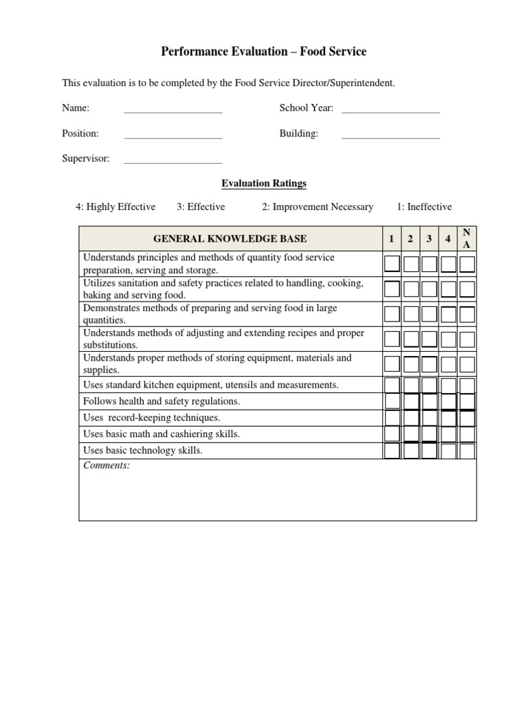 The food service evaluation form is tailored for assessing the overall performance of food service staff, focusing on promptness, customer. Restaurant managers and supervisors can use the food service employee evaluation form template in clickup to assess and provide feedback on. The food service employee evaluation form is designed to assess the performance of food service employees across various.