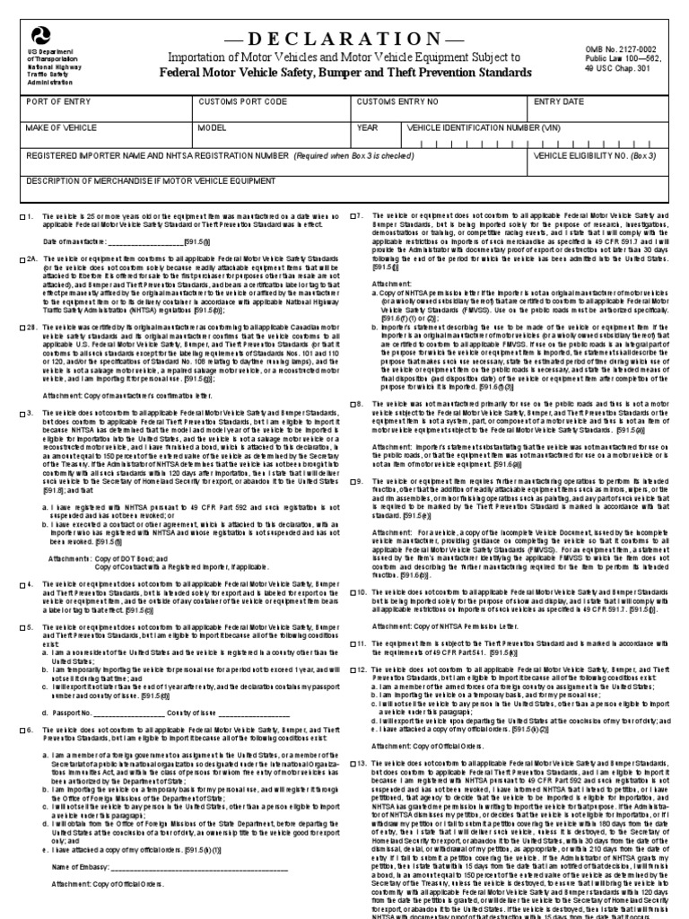 Importer's statement describing the use to be made of the vehicle or equipment item if the. Importers of motor vehicles/engines and nonroad. By authority listed in title 49, code of federal regulations, part 7, there are fees assessed by.