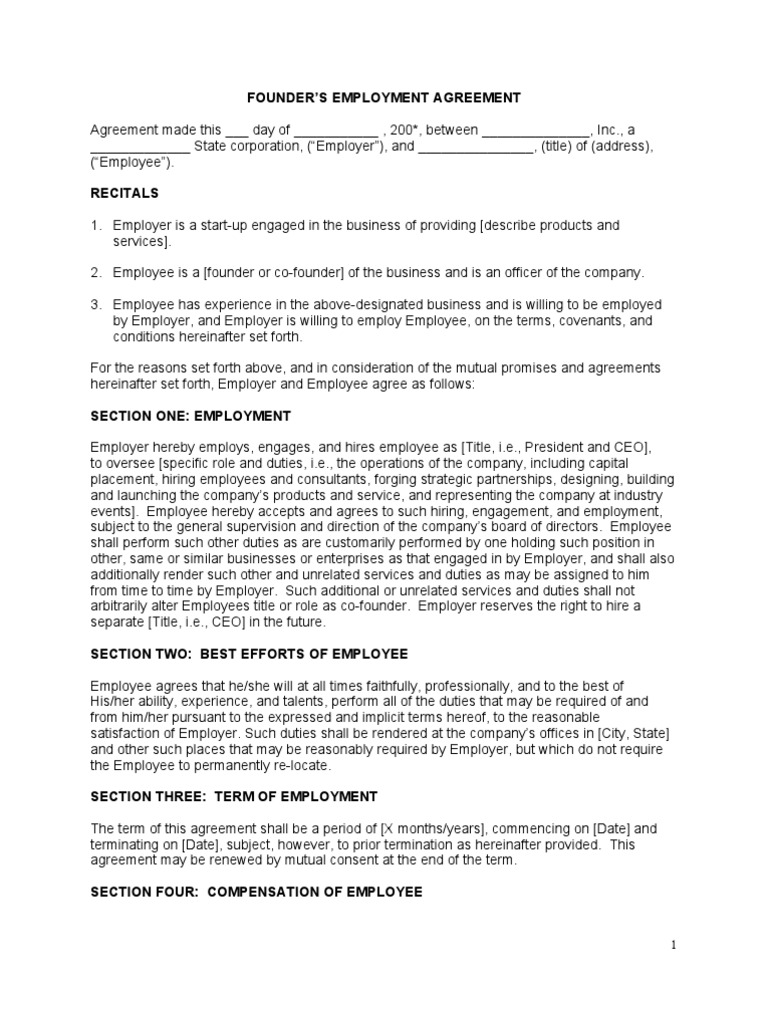 Founder Employment Agreement Template - This founders’ agreement (herein referred to as agreement) is made o n _____ day of _______________, 20_____ and defines the. Founder employment agreement template (india) | os v.1 | november 2016 2 2.4 the founder represents and warrants to the company that,.