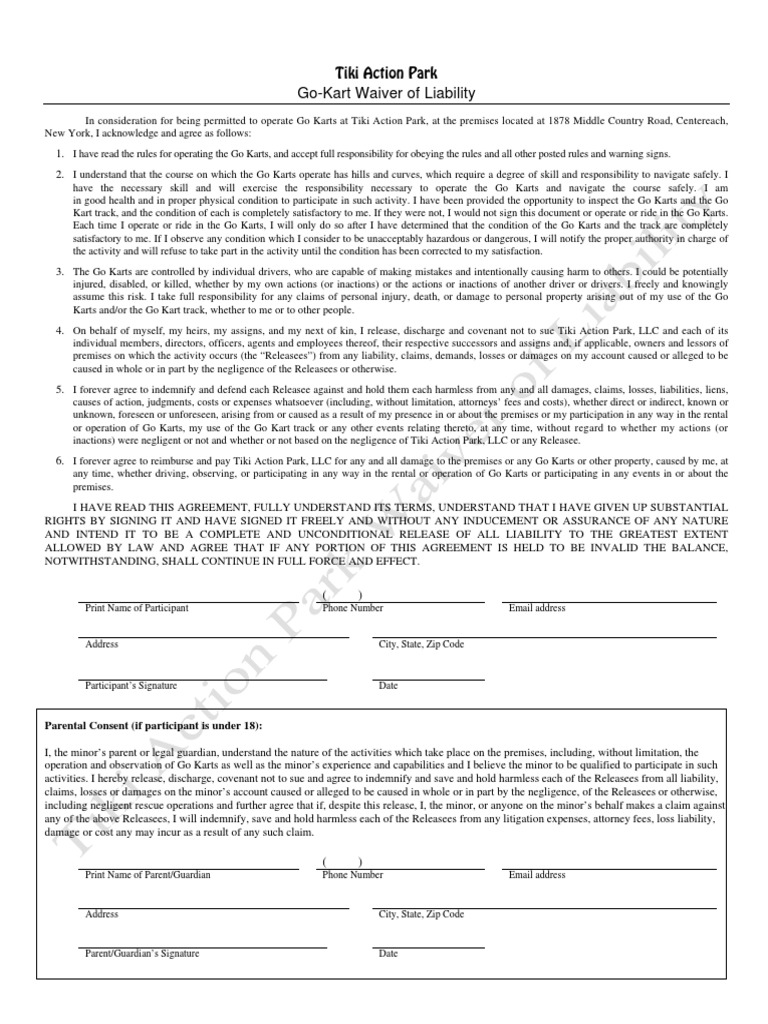 I have read this release and waiver of liability, assumption of risk and indemnity agreement, understand its terms, understand that i have. Edit, sign, and share go kart waiver form online. No need to install software, just go to dochub, and sign up instantly and for free. A waiver protects your business from legal liabilities by ensuring that participants acknowledge the risks associated with go. This release shall be binding upon.