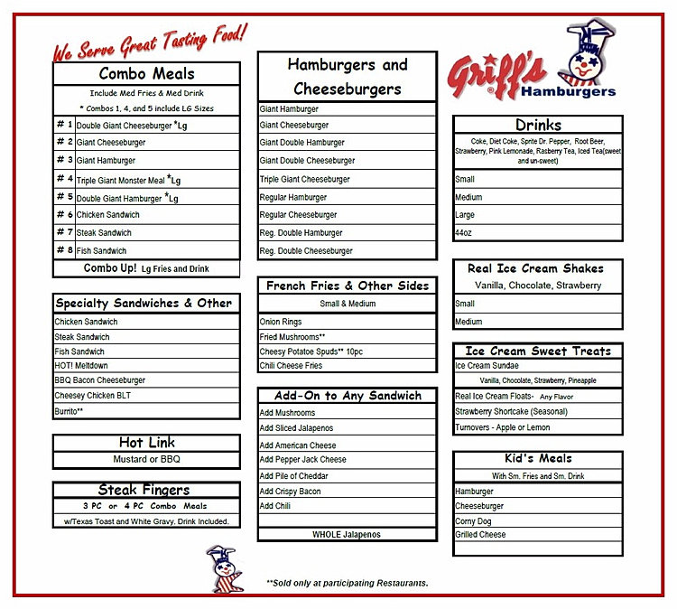 Griff S Hamburgers San Antonio Menu - We serve great tasting food! The actual menu of the griff's hamburgers fast food. Prices and visitors' opinions on dishes. View the menu, check prices, find on the map, see photos and.
