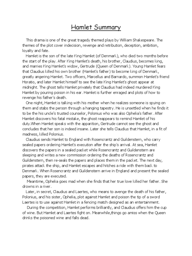 A brief overview of the plot and major events of shakespeare's hamlet, organized by acts. The ghost of the king of denmark tells his son hamlet to avenge his murder by killing the new king, hamlet's uncle. When horatio sees the ghost, he decides they should tell prince hamlet —his closest friend and the dead king's son. Hamlet is also the nephew. Learn about the ghost of king hamlet, the murder of.