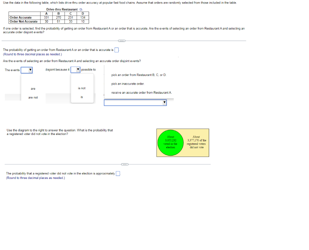 Are the events of selecting an order. Are the events of selecting an order from restaurant a and selecting an accurate order disjoint events? Let's assume the probability of getting an order from restaurant a is p(a), and the probability of getting an inaccurate order is p(not accurate). When randomly selecting adults, let m denote the event of randomly selecting a male and let b denote the event of randomly selecting someone with.