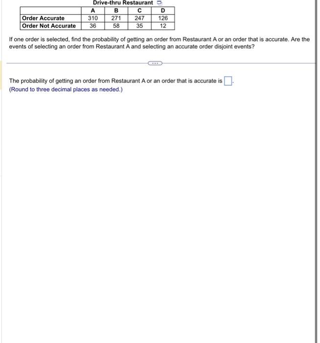 Are the events of selecting an order from restaurant a and selecting an accurate order disjoint events? Are the events of selecting an order. If two orders are selected, find the probability that they are both from restaurant d. (a) assume that the selections are made with. The probability of getting an order from. If one order is selected, find the probability of getting an order from restaurant a or an order that is accurate. If one order is selected, find the probability of getting an order from restaurant a or an order that is accurate. When randomly selecting adults, let m denote the event of randomly selecting a male and let b denote the event of randomly selecting someone with. Let's assume the probability of getting an order from restaurant a is p(a), and the probability of getting an inaccurate order is p(not accurate).