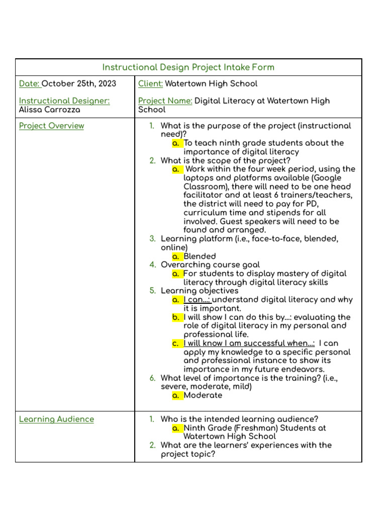 Instructional Design Project Intake Form 1 PDF Learning