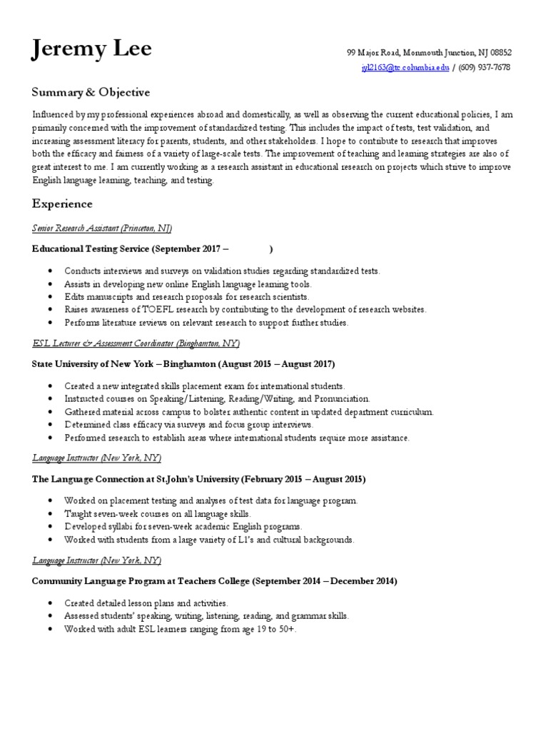 Jeremy Lee Resume PDF English As A Second Or Foreign Language