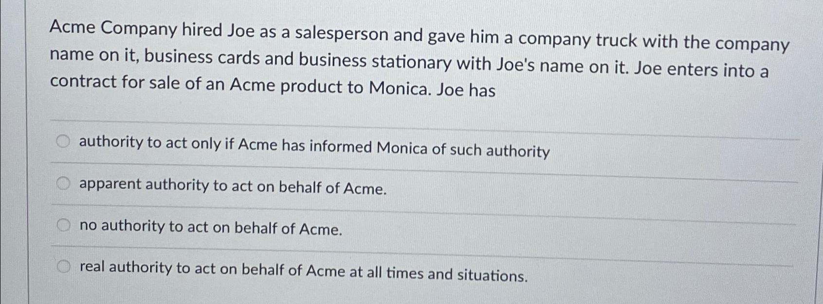 Solved Acme Company hired Joe as a salesperson and gave him