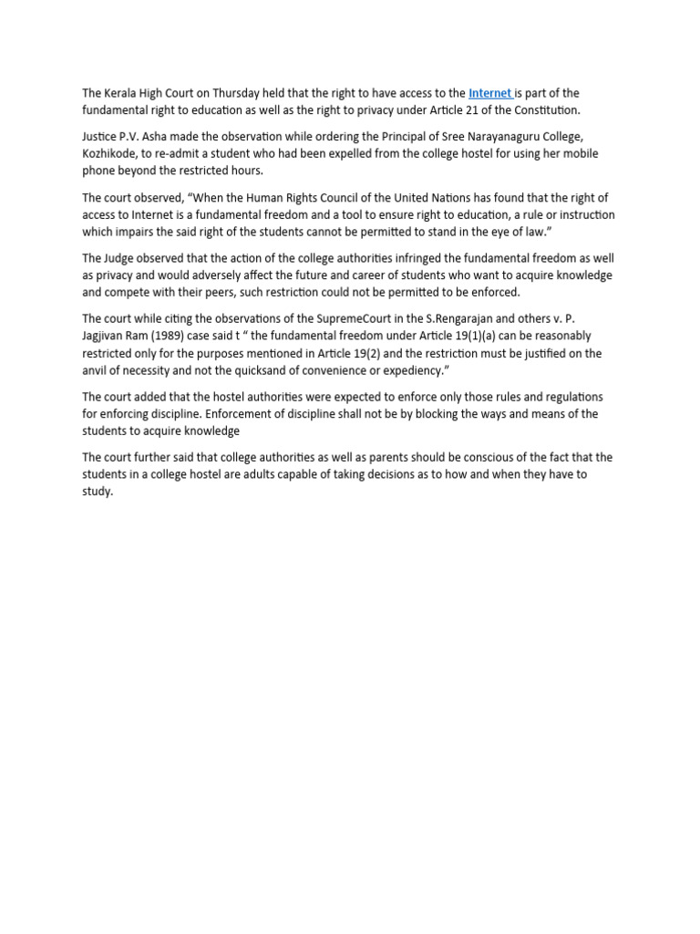 The Kerala High Court On Thursday Held That The Right To Have Access To
