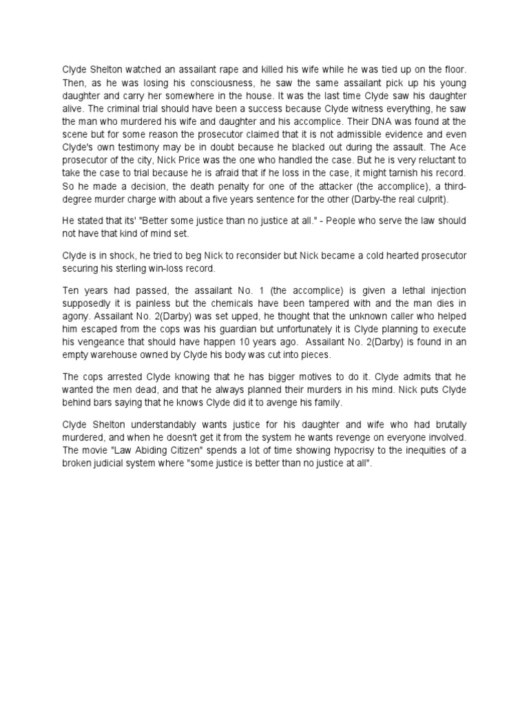 Law Abiding Citizen Parents Guide - This is an excellent movie that shows some of the corruption of the legal system. Contains intense graphic violence with blood.