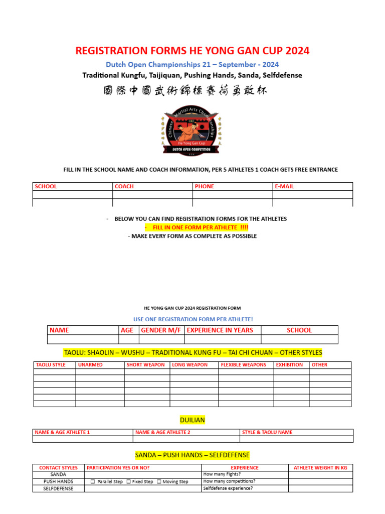 Registration Forms Martial Arts He Yong Gan Cup 2024 Championships