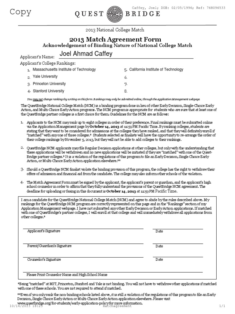 Match Agreement Form Questbridge - Review and begin preparing match requirements for the schools you. The match agreement form (available after submitting match rankings form) is also due october 10. To download it, click on the. Submit your match agreement form if you are ranking colleges. Students selected as questbridge national college match finalists will have the opportunity to rearrange the order of their college rankings. We understand that many students may be unable to print the match agreement form or obtain signatures from their counselor in. After logging in to your manage page, navigate to the rankings & regular decision tab on the far right. > submit your match rankings and match agreement form.* > review and begin preparing match requirements for the schools you.
