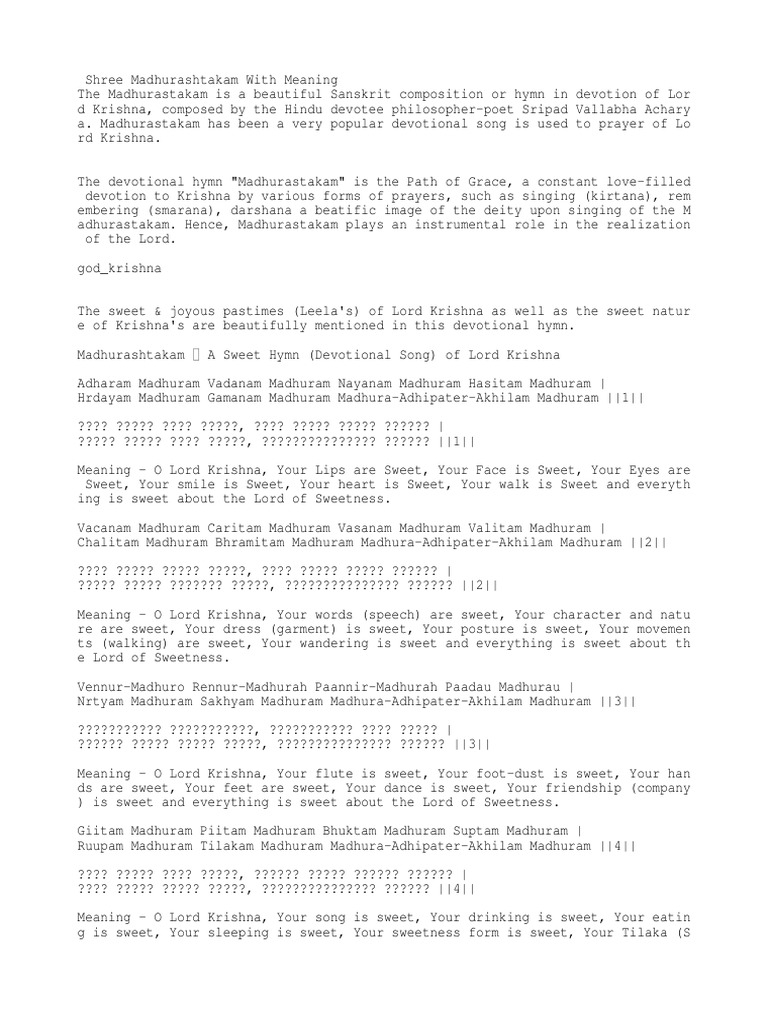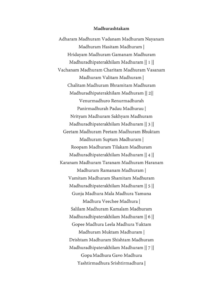 Krishna’s lip, face, eye, smile, heart and gait are all sweet and nice. Madhuradhipateh (madhuradhipateh) = lord of all sweetness!; 67 rows the madhurāṣṭakam (sanskrit: मधुराष्टकम्), also spelt as madhurashtakam, is a sanskrit ashtakam in devotion of krishna,.