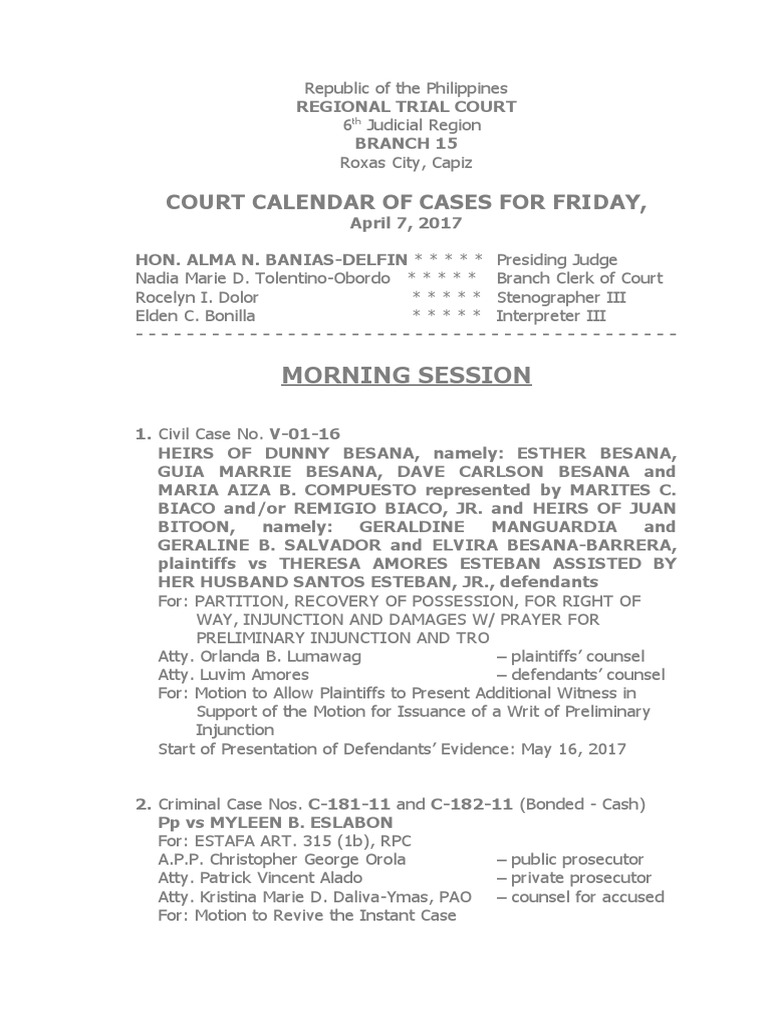 April 7, 2017 Regional Trial Court Calendar of Cases in Roxas City