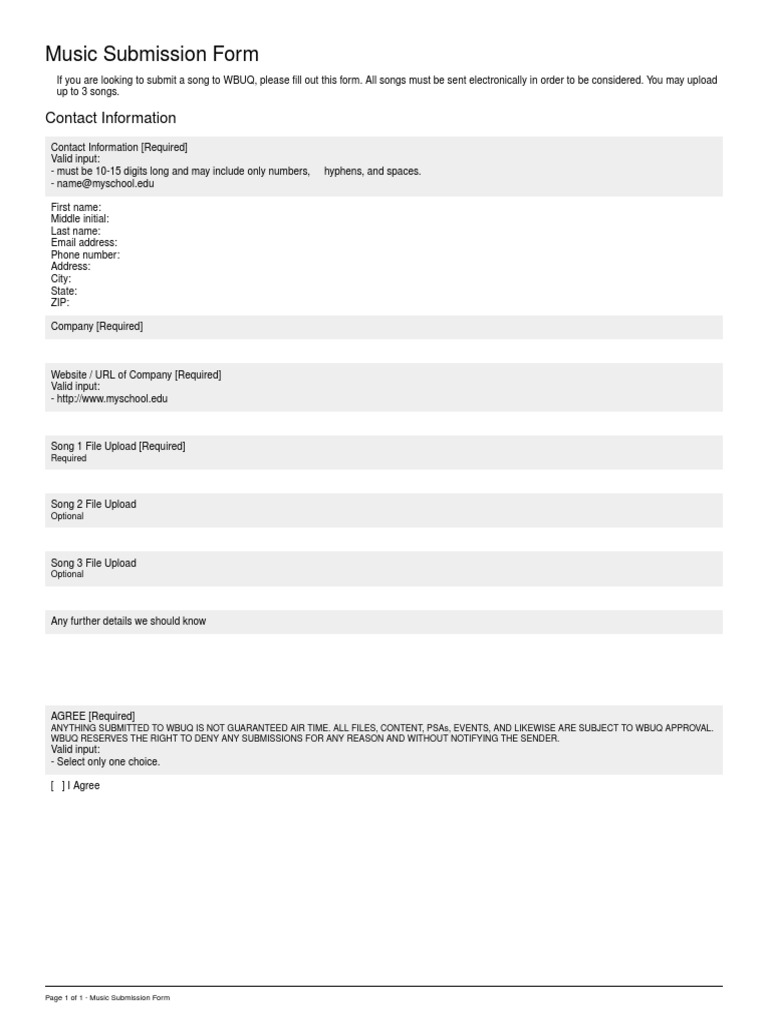Music Submission Form - Get a dedicated support team with jotform enterprise. Easily create a secure music submission form with file request pro. A music submission form is a versatile form template designed for music. This file contains the music submission form and instructions for submitting your music entry. Fill in your personal information and contribution. A music submission form is a type of form used by producers to receive music from music producers quickly and securely. Fully customize fields, add branding, and. What is the general genre? (check all that apply) * provide a url to your website / streaming platform (ie.