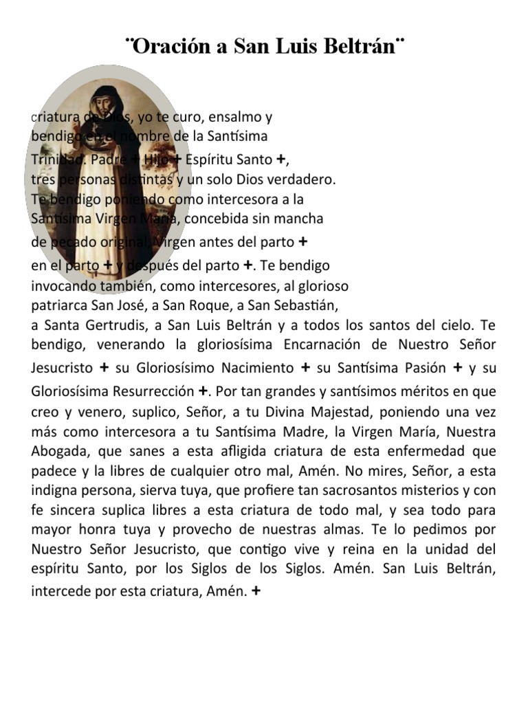 Querido san luis beltrán, humilde siervo de dios, te pido que intercedas ante nuestro padre. San luis beltrán, te imploramos con devoción, y fe sin cesación. No miras la indignidad de los que invocan tu santidad.