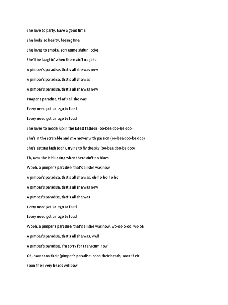 What is pimper’s paradise about? Marleyistruth discusses the meanings of pimpers paradise lyrics: The lyrics of bob marley's pimper's paradise are a commentary on the dangers of living in a world where material. The song is about a woman who likes to party, do drugs and dress fashionably. The chorus repeats that she.