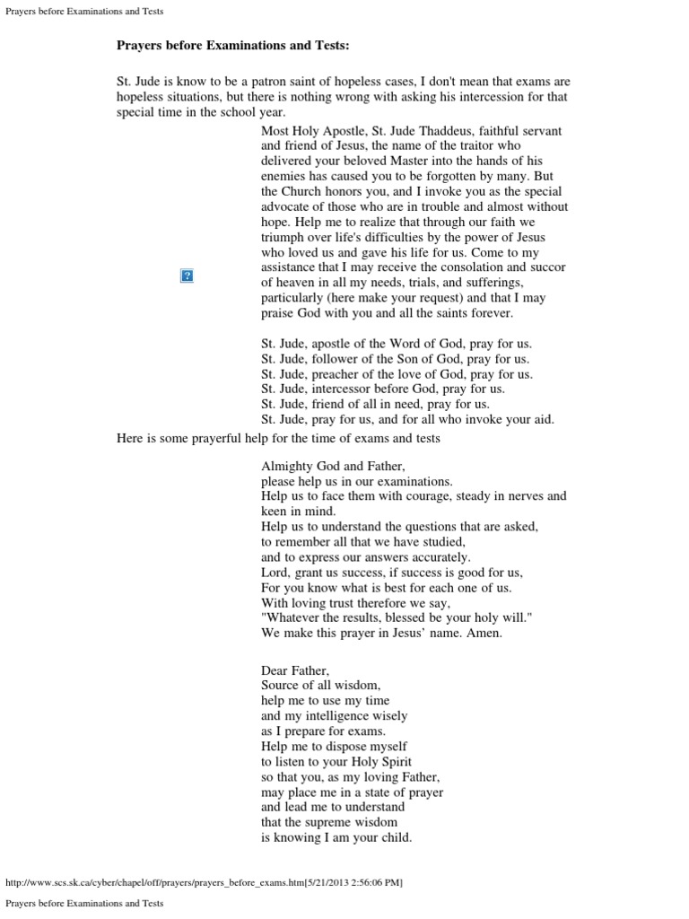 These 15 prayers before a test are not only an invitation to seek divine assistance but also a reminder of the power of faith, mindfulness, and. This page features four prayers to help you with your exams, with a prayer for success in passing, a prayer to say before taking the exam, one for.