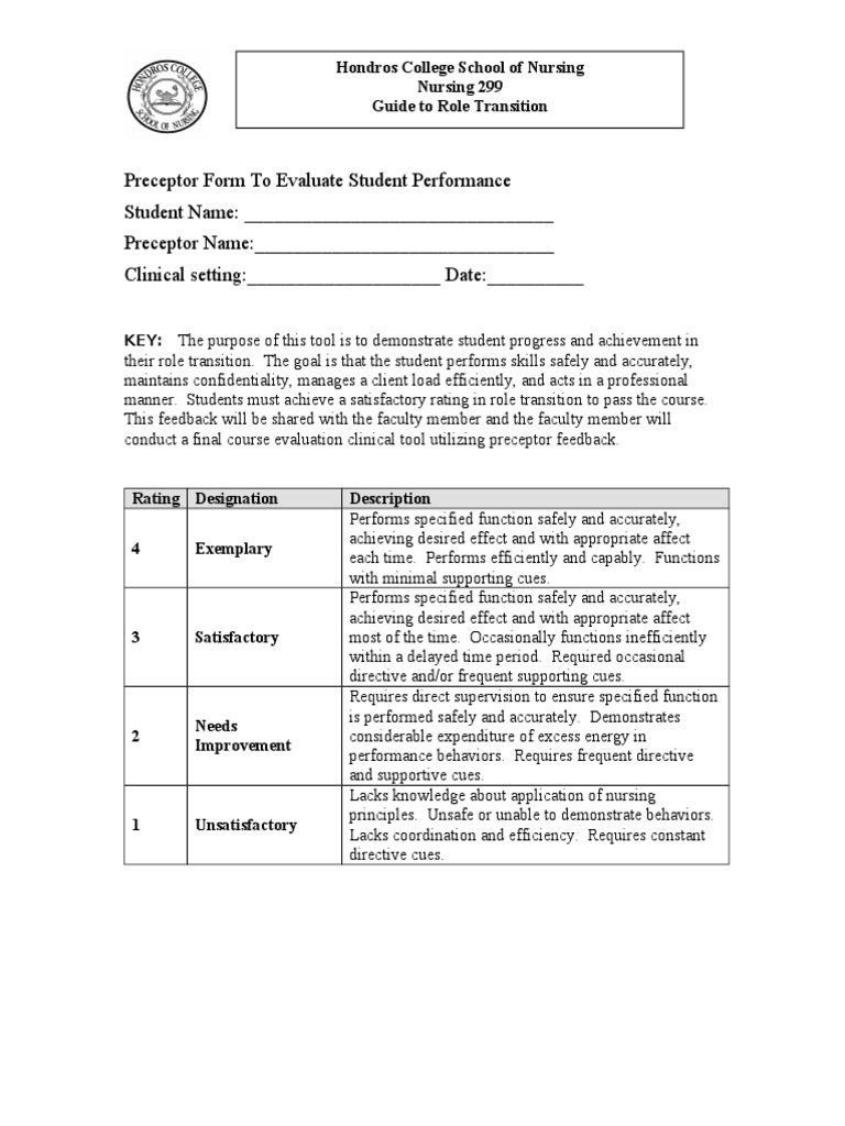 The preceptorship in this clinical area provided. The preceptor is asked to evaluate the student's performance through chart review, direct observation, case discussion and performance. The information provided is necessary for the maintenance and improvement of the statewide. A nursing preceptor evaluation form is a form template designed to assess the performance and effectiveness of nursing. All preceptor evaluation ratings.