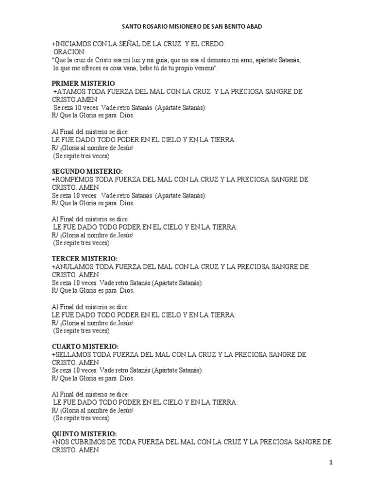 Rosario De San Benito Abad - Este documento presenta las oraciones del santo rosario misionero de san benito abad, el cual consiste en cinco misterios, letanías a dios.