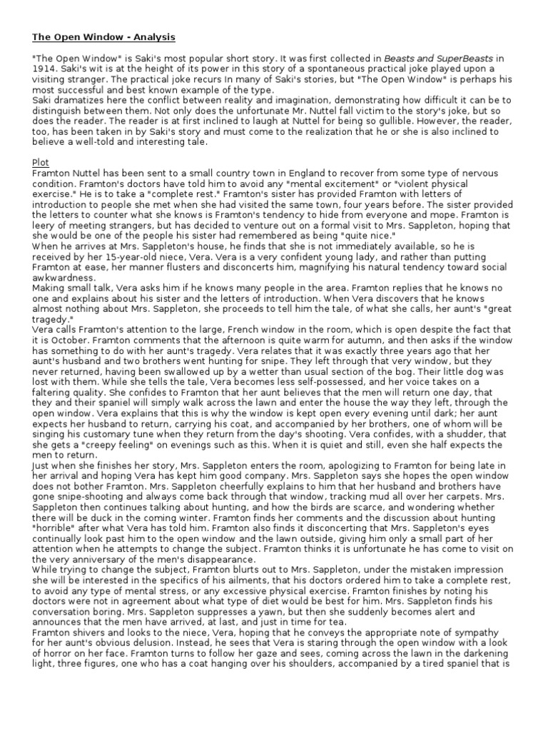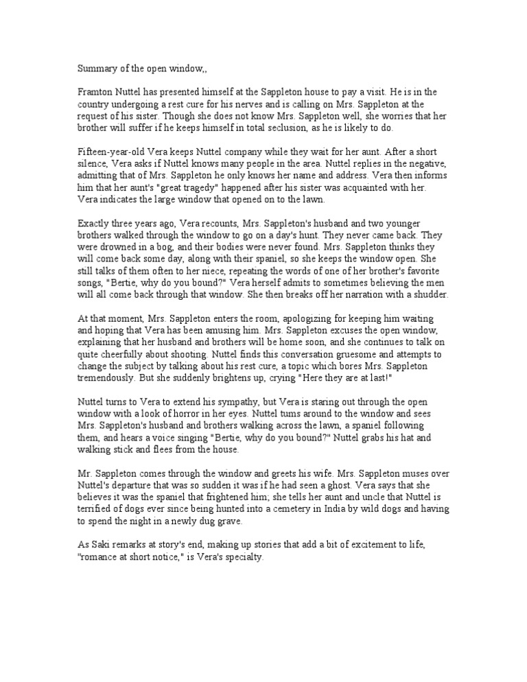 Saki Open Window Summary - What happens in ‘the open window’, in. Get all the key plot points of saki's the open window on one page. The open window by saki is a 1914 short story about framton nuttel, who is frightened by the.