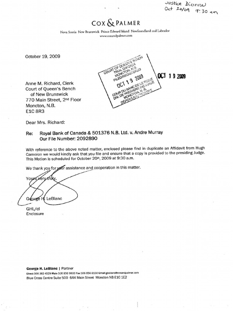 October 19, 2009, Cover Letter to Clerk of the Court, Anne Richard