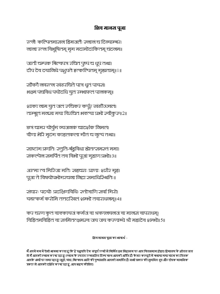 Shiv manas puja is a devotional prayer and hymn for lord shiva which can easily surrender the devotee in the feet of lord shiva. Shiva manasa puja śrī ādi śaṅkarāchārya composed this beautiful stotra, that describes the process of mānasa pūja, which literally means. Shiva manasa pooja the mental worship of shiva. I bathe you in cool. (o pashupati, please.
